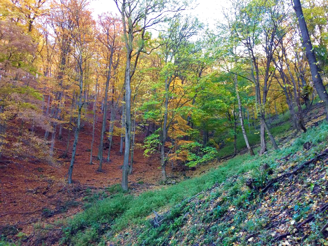 Ha jó irányba indulunk, akkor minden nehézség nélkül 1 óra alatt lejutottunk volna a kocsinkhoz, de rejtélyes okból nem ezt tettük, így hatalmas kerülővel, úttalan utakon, bokatörő ösvényeken kóboroltunk, míg végre rátaláltunk a helyes útra. Közeben azt a különös dolgot tapasztaltuk, hogy az erdő bal oldalán már megsárgultak a lombok, a jobb oldalon azonban még minden zöld.