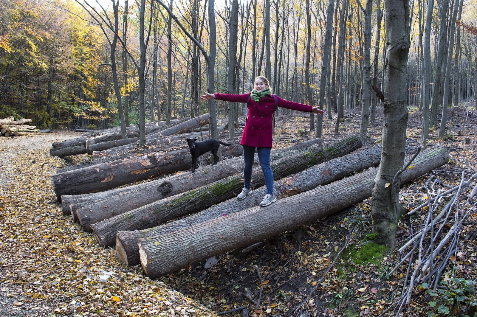 Az út harmadánál hangos gépekkel vágták a fát, ezért balra kanyarodtunk, egy erdészeti földútra. Egy idő után már csak egy keskeny ösvény vezetett egyre meredekebben a csúcs felé. A szélcsendes és napsütötte hegyoldalon lekívánkozott rólunk a télikabát, és békésen elheveredtünk az avarban, élveztük az őszi napsütést, a csöndet és a magányt.