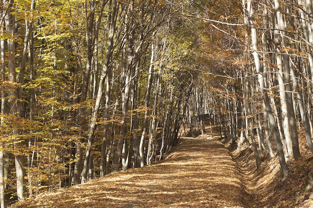 majd aszfaltozott, ámde levelekkel borított út vezetett tovább az erdőn keresztül. Ragyogóan sütött a nap, és mi tobzódtunk az ősz színeiben.