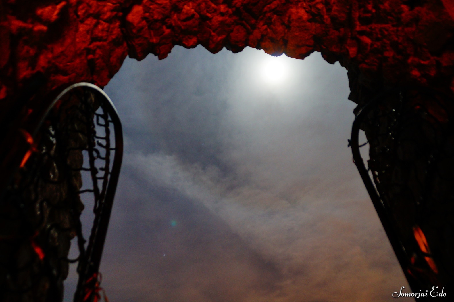 A kápolna ajtajából látni a teliholdat, melynek most hatalmas szivárványos udvara van.